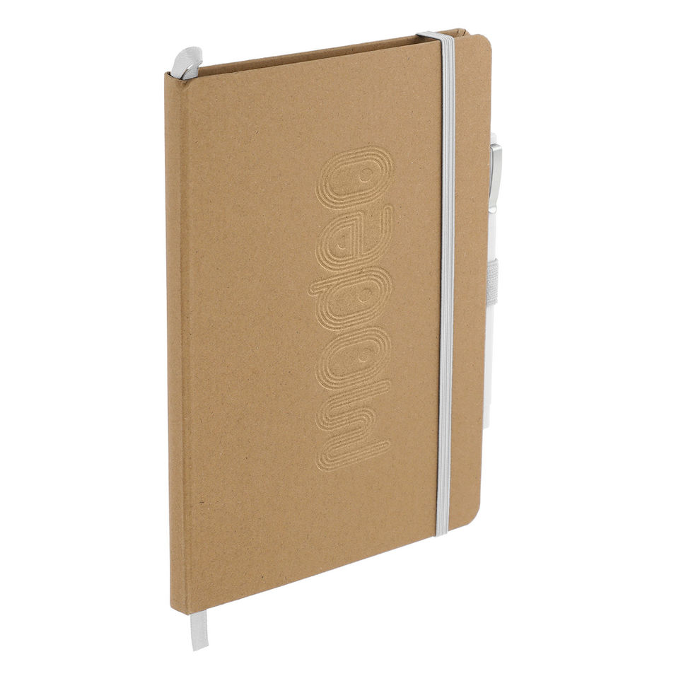 This Eco Color Bound JournalBook Set includes Eco Color Bound Journal and Ambassador Square Ballpoint pen. The Journal features a recycled paper hard bound cover, color accent painted edge pages, and color matching built-in elastic closure and pen loop. This specialty notebook includes a ribbon page marker, expandable accordion pocket, and 80 sheets of lined paper. Due to the nature of the material, there may be color variances.
